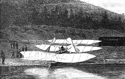 Der Franzose Victor Tatin baut ein Motorflugmodell mit Luftschrauben und Druckluftmotor, das erfolgreich Bodenstarts ausführt. |
